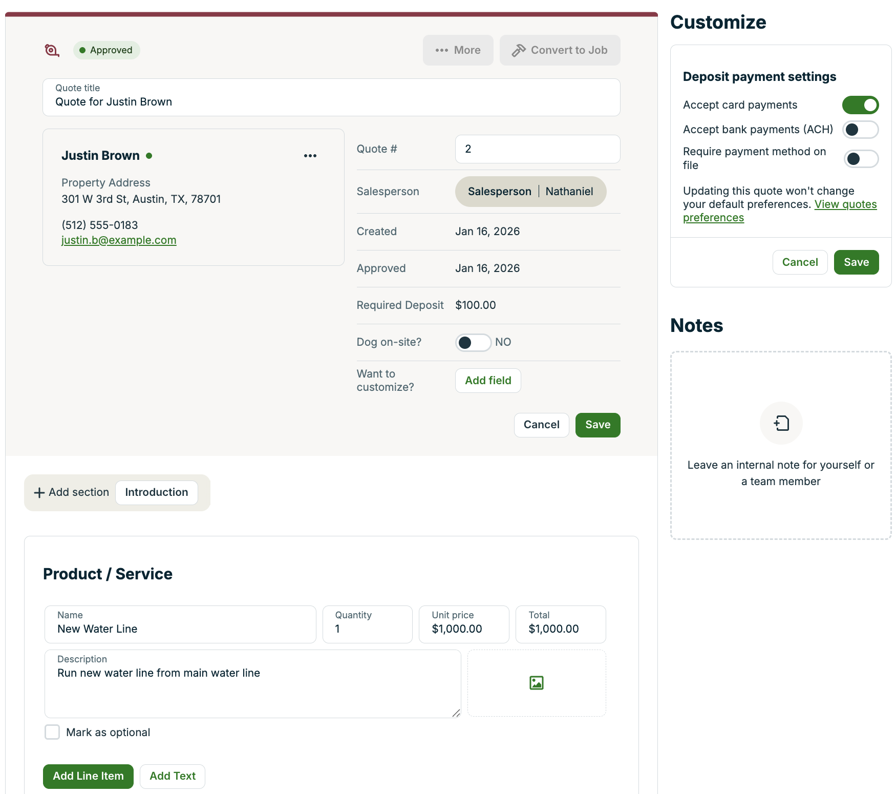 - Convert to Job: To convert this quote into a scheduled job—this will change this quote's status to Converted