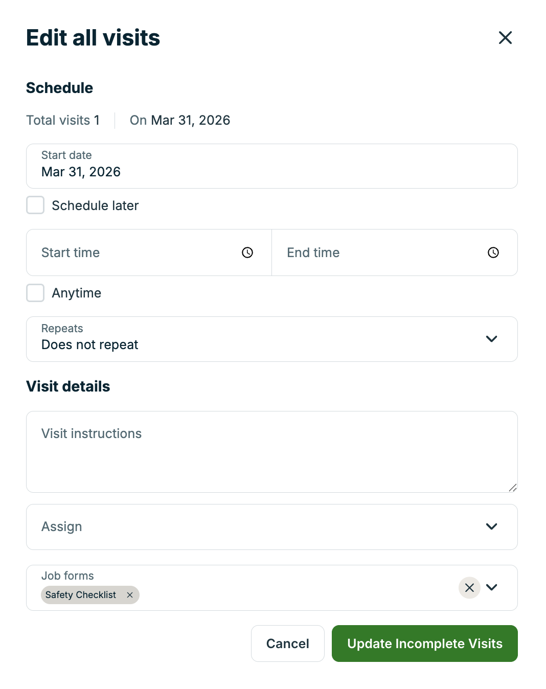 Note: Updates made here apply to all incomplete visits in the job.