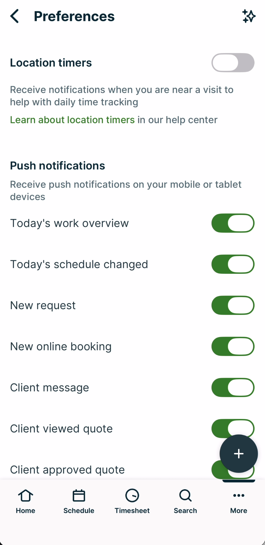 Admin users can manage push notifications (including disabling them) in the Jobber App by selecting More from the bottom navigation menu, then selecting Preferences.
