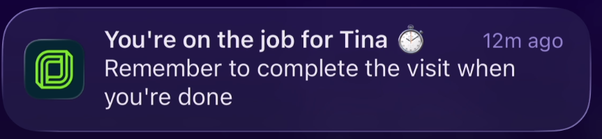 You're on the job for [client name]: This notification appears when a visit timer is running. It will indicate the client's name in the notification so you know which visit this refers to. Tap this notification to open the visit.