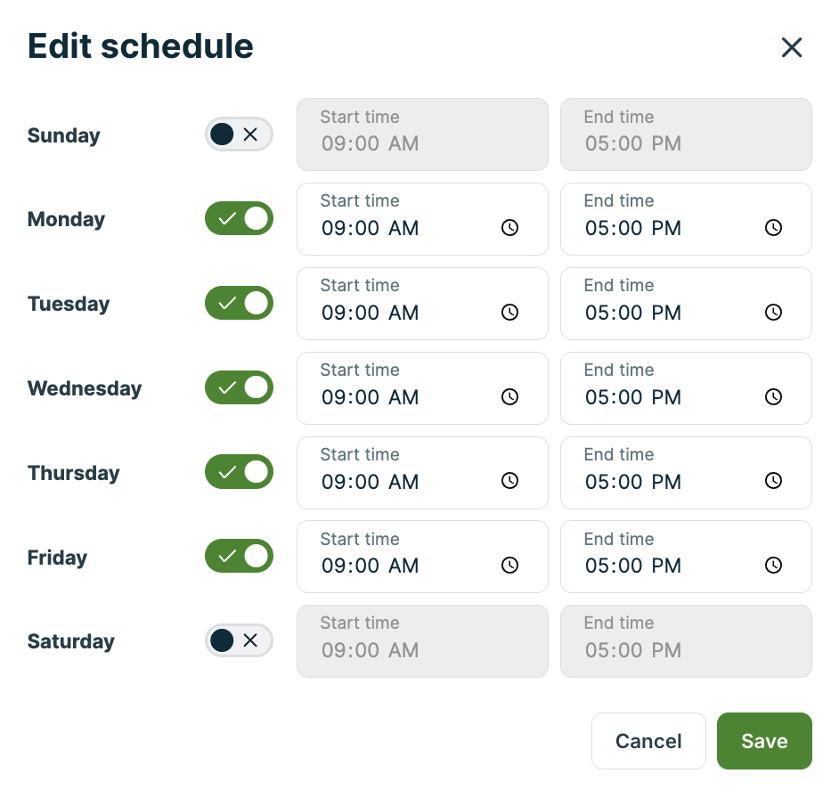 - Customize each day of the week this employee is available and what their start and end times on that day are.