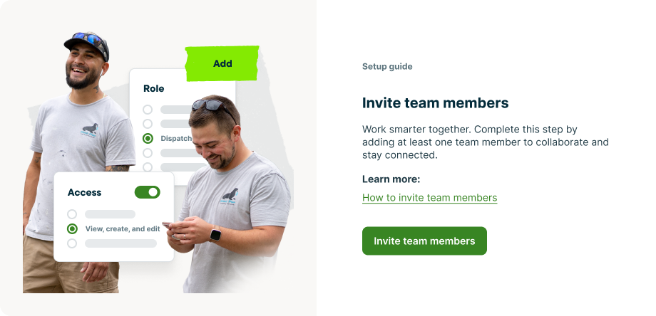 The dynamic set up guide uses the information you supplied while creating your Jobber account to get you started with actions in Jobber that align with your goals. The set up guide will prompt you to complete tasks that fall into three categories: