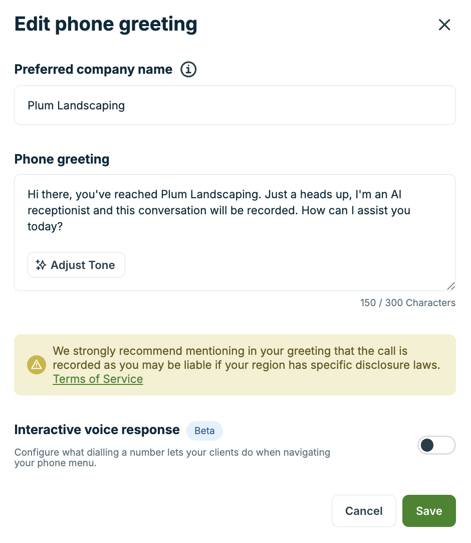 The phone greeting is created automatically by the Receptionist, however it can be edited to reflect your business and the tone you’d like to set when callers get in touch.