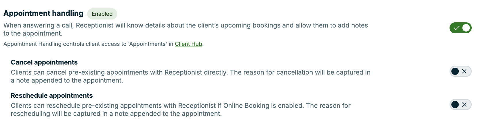 Note: When appointment handling is disabled, clients won't be able to view their appointments in client hub as they won't have access to the "appointments" tab.