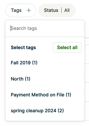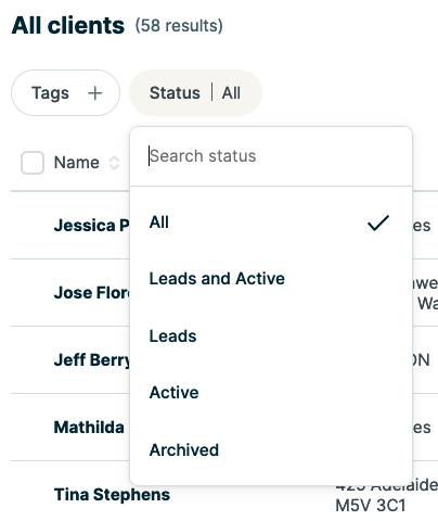 To narrow down your client list, tags and statuses can be used as filters. Click Tags or Status to open a list of all tags and statuses and select one to filter the list. If you are filtering the list with tags, multiple tags can be selected. Learn more about Tags.
