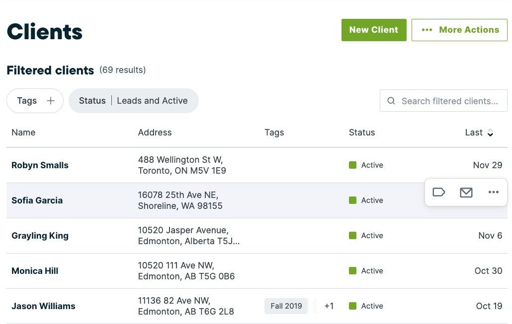 The clients list is where you can view, search, and manage all of your clients in Jobber. From this page, you’ll see a complete list of your clients along with tools to filter, sort, and take action; so you can quickly find the information you need and keep your client records up to date.