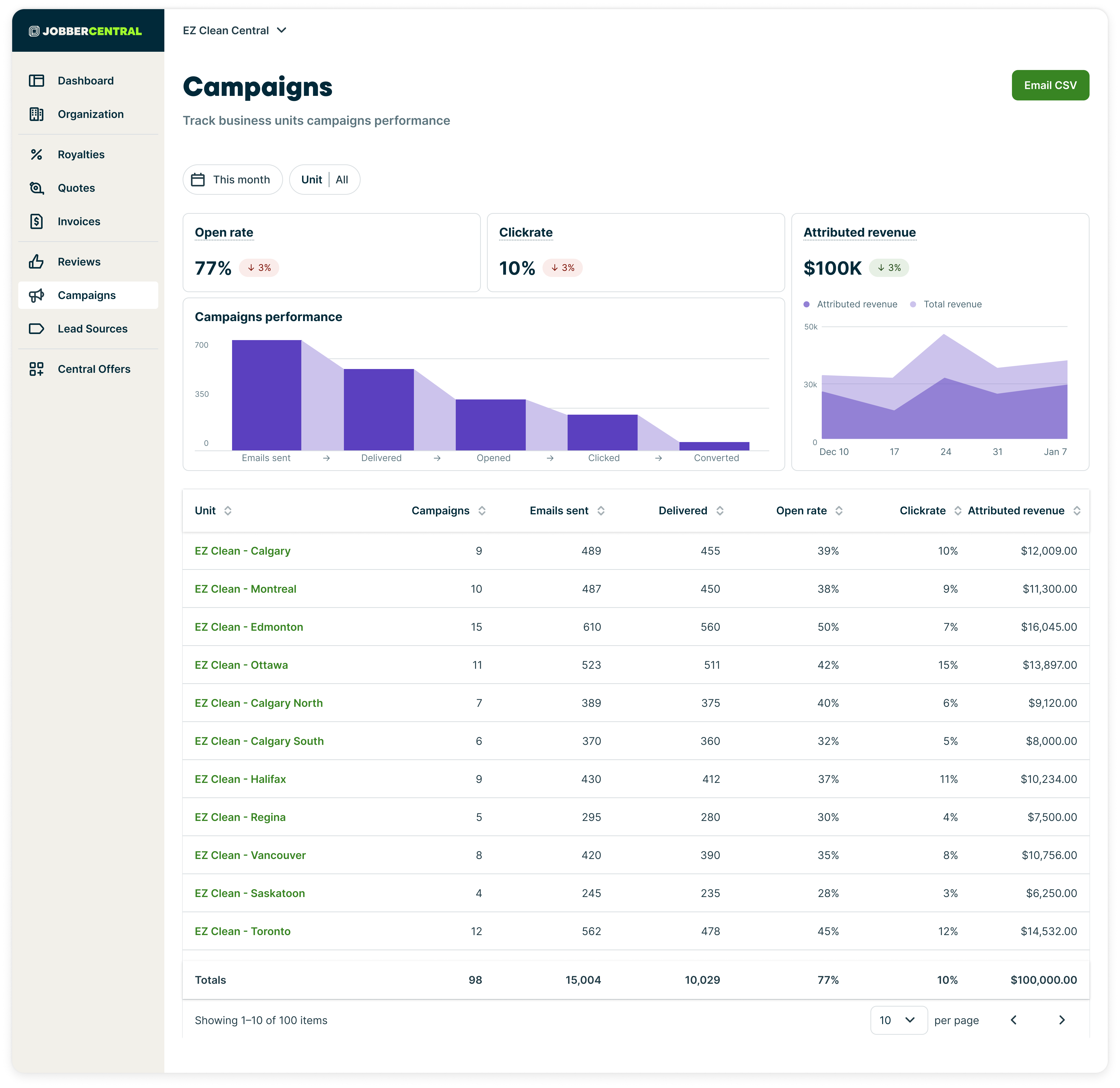 The campaigns module in Jobber Central gives you a centralized view of marketing email campaign performance across all business units in your organization. Instead of reviewing campaign data one account at a time, you can monitor email volume, engagement rates, and attributed revenue across your entire network from a single place.