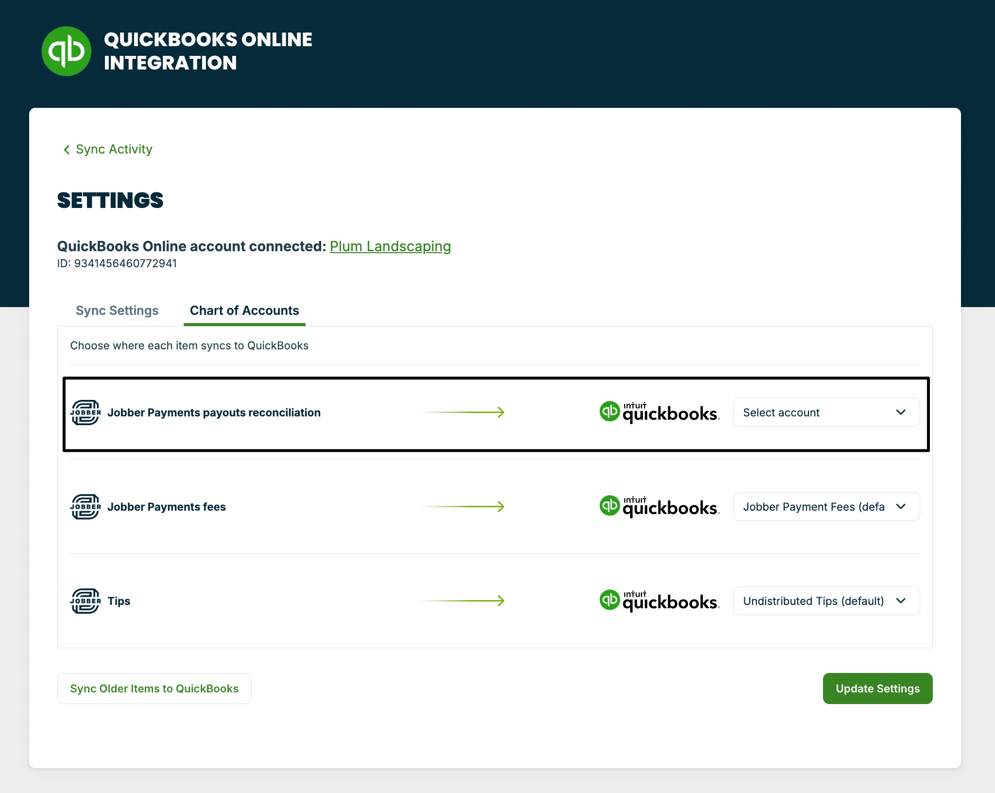 - From the QuickBooks Online sync activity dashboard, select the button for Sync Settings.