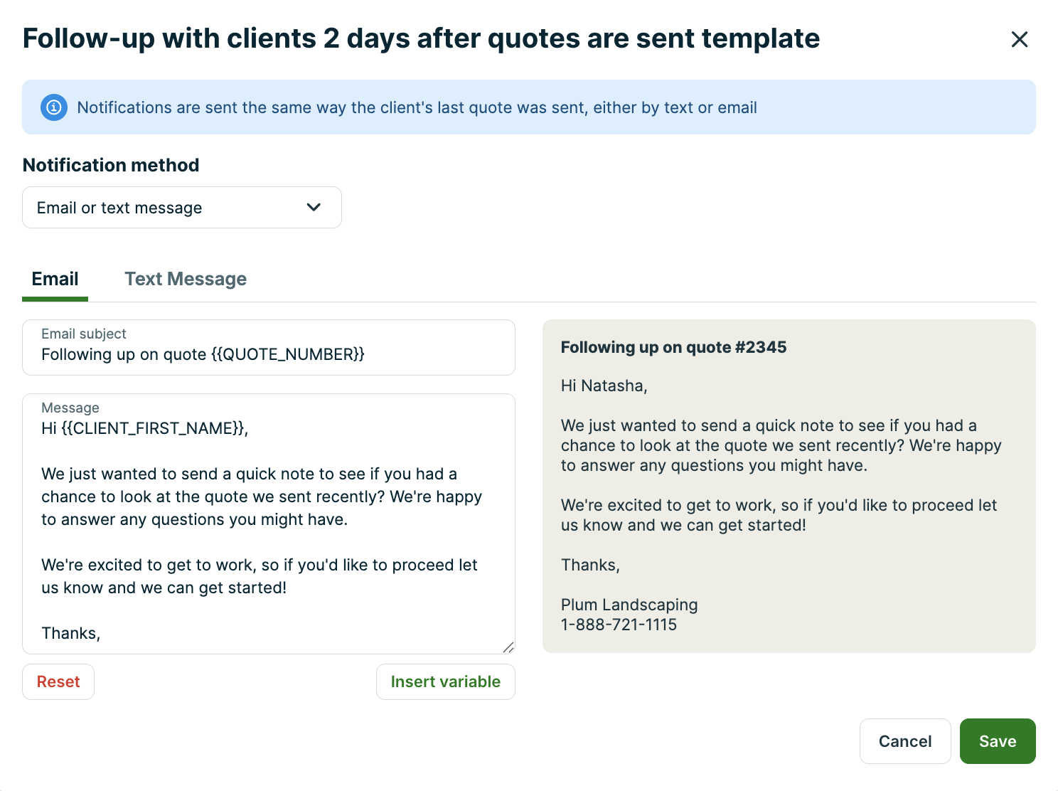 Another option to follow up on quotes is by using Quote Follow-ups, with this feature you can set up a notification that is sent automatically to your client to remind them about their quote. These follow-ups are sent the same way the quote was sent according to a schedule you set up. So if you originally texted the quote to your client, the follow-up will also be sent via text according to your selected number of days.