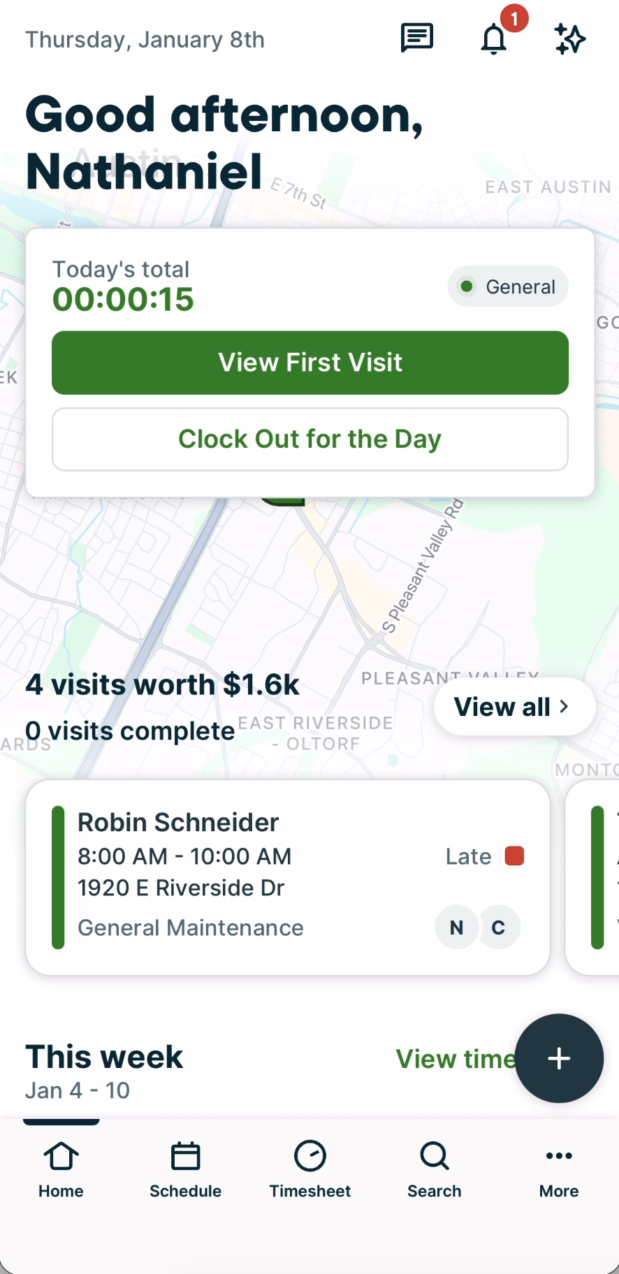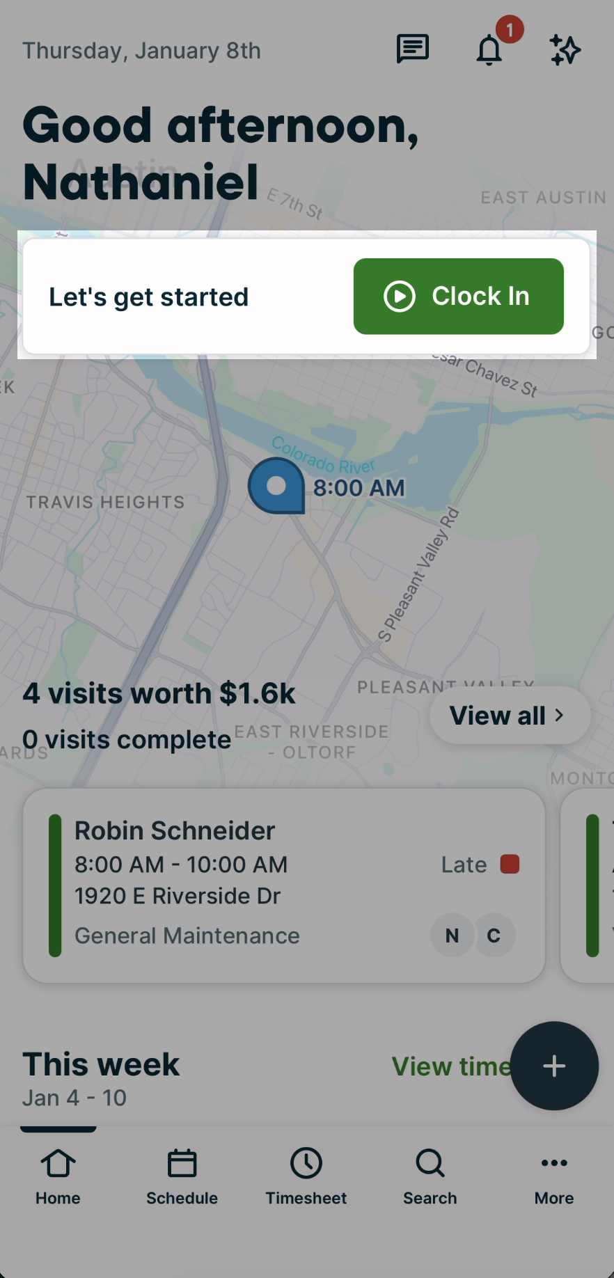 At the beginning of your workday, clock in from the home page of the Jobber app to start tracking time.