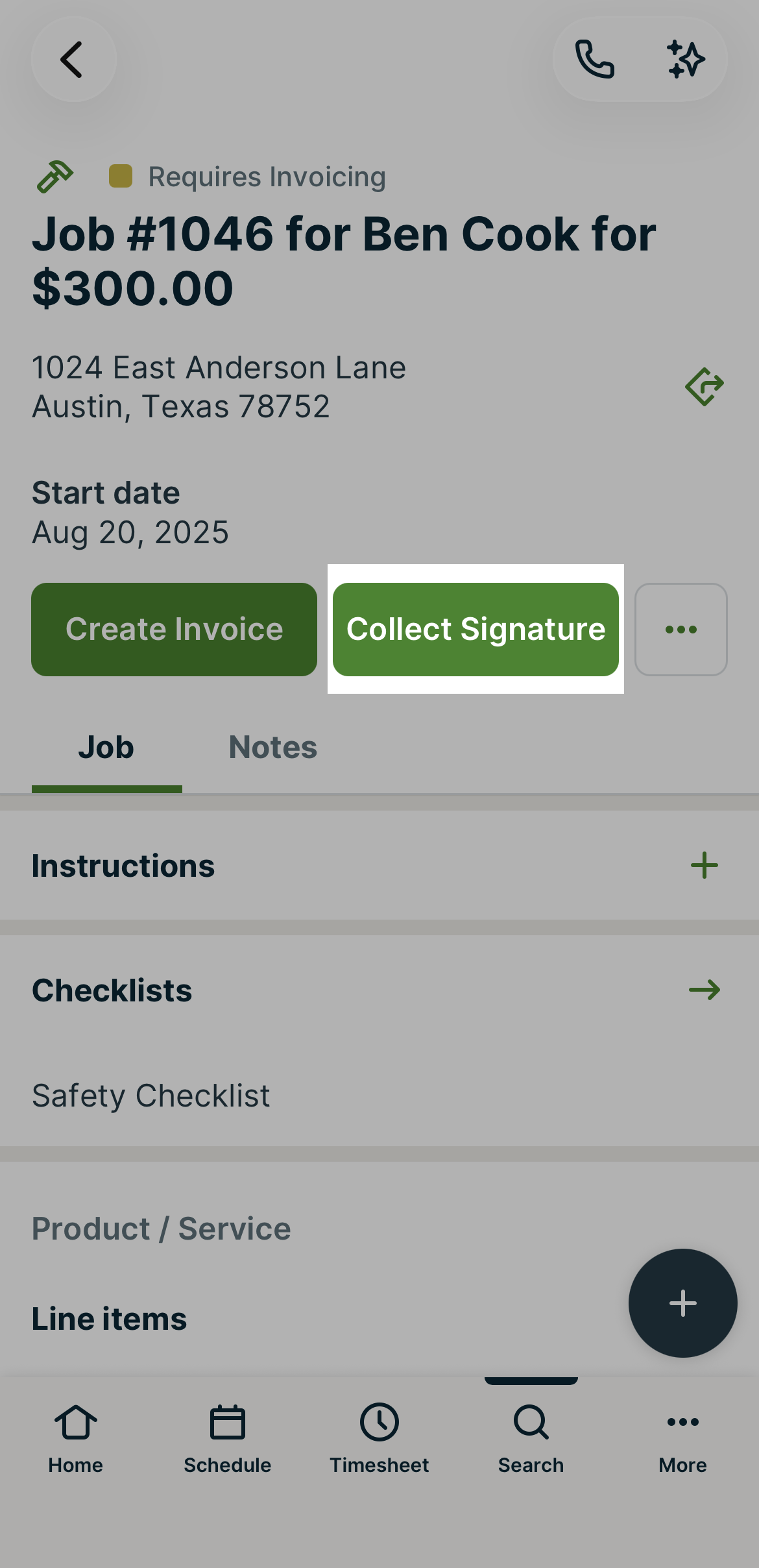 For jobs in "requires invoicing" status, Collect Signature button will appear. For jobs in other statuses, tap More actions (...), then Collect signature to open the signature pad.
